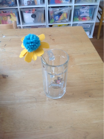 1st are some felt and yarn flowers I made. I saw this post and this pinterest pin and then searched for more and had to make some. I had to scratch that itch. I LOVE THEM. I had Emily and her friend Tara make one each for their teacher for one of the days of Teacher Appreciation Week. Wednesday was bring a flower (real, fake, drawn, etc.). I used my clover pom pom tool and wool felt (although for Emily's, the blue one, she used acrylic felt). I used the tutorial from deliacreates for the Black Eyed Susan's.